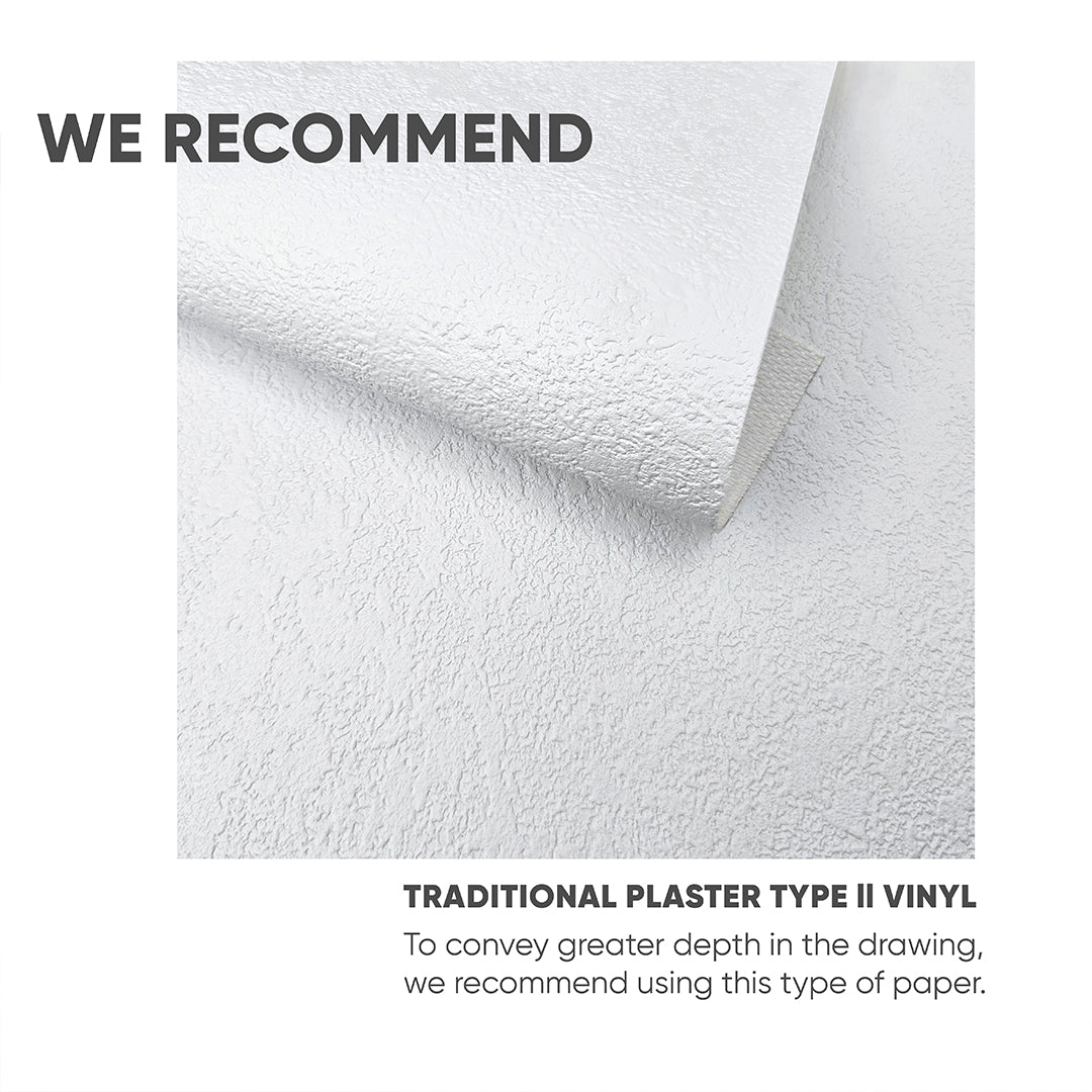 - Traditional Unpasted Plaster Type II Wallpaper : Industrial Plaster texture. Matte finish. For long-term installations. Requires professional installation and wallpaper glue (Not included). Overlap double cut removal is recommended.